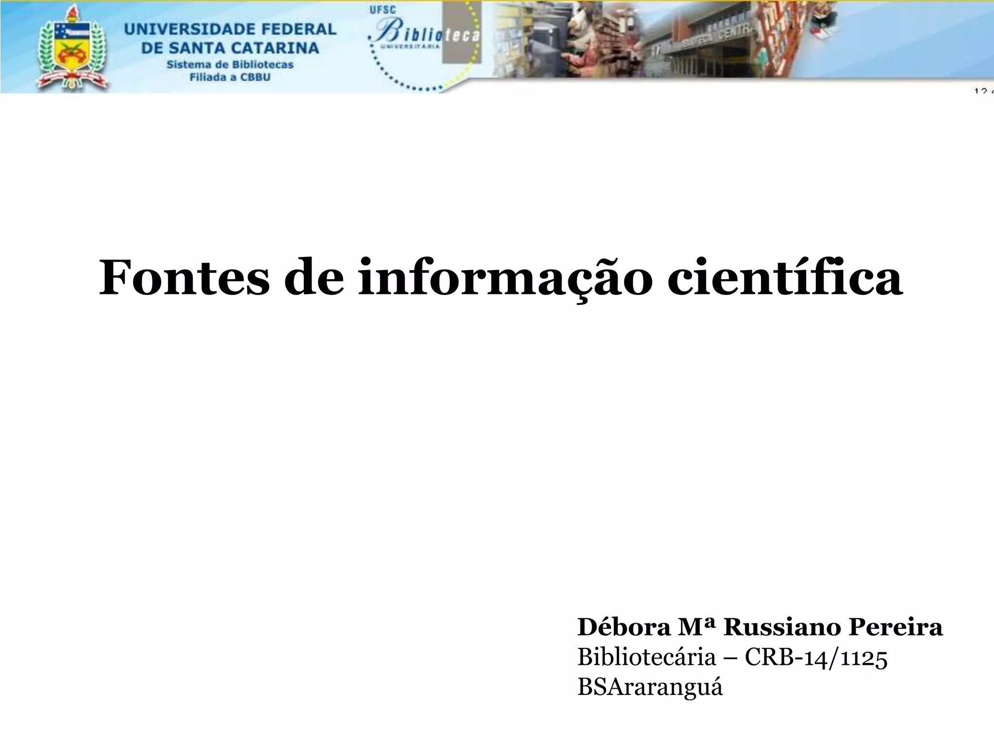 Este documento fornece uma introdução às fontes de informação científica e o processo de pesquisa. Ele discute o que é pesquisa, classificações de pesquisa, etapas de pesquisa, fontes de informação primárias, secundárias e terciárias, e estratégias para buscar informações em fontes como palavras-chaves, operadores booleanos e sinais.