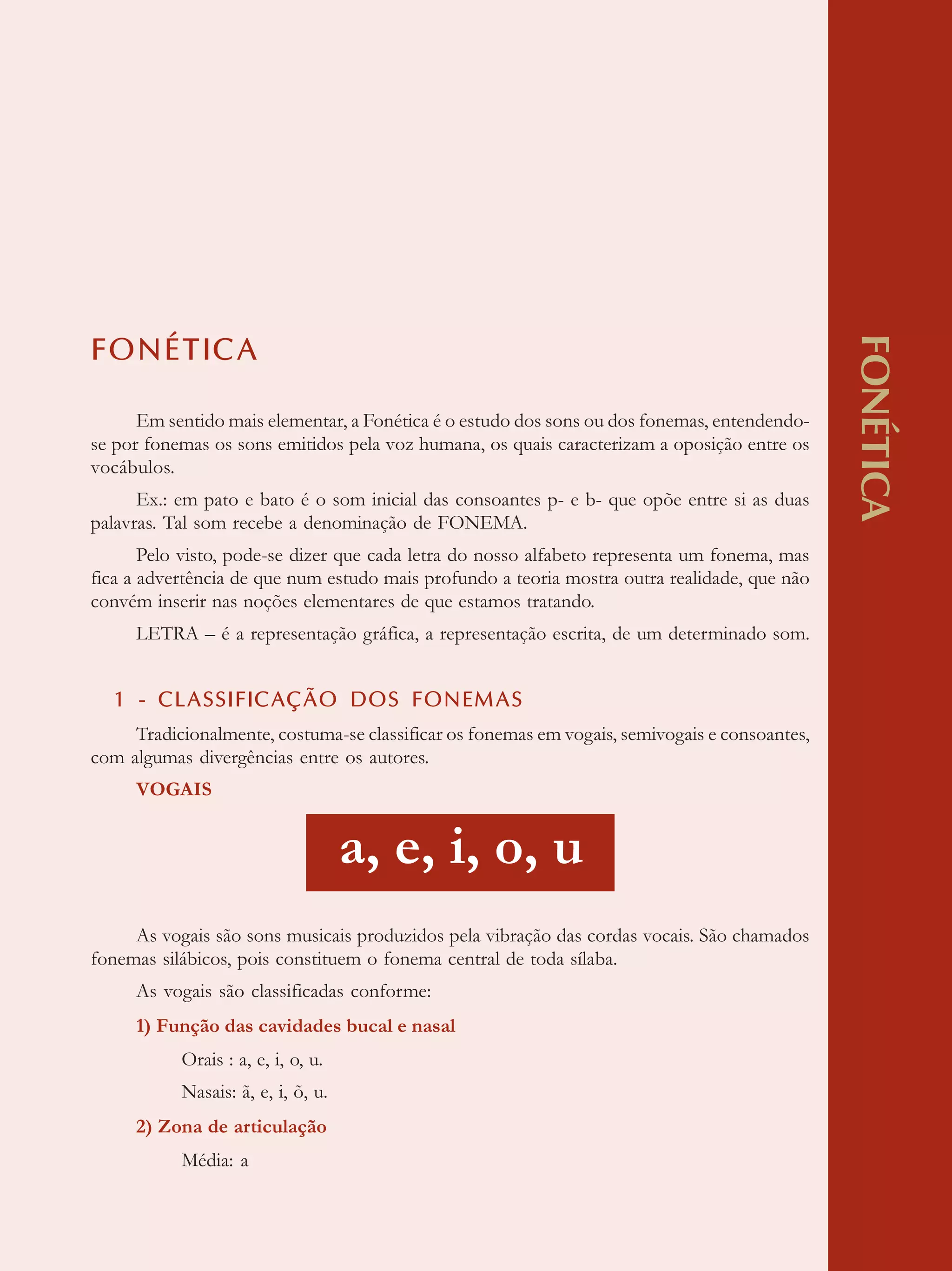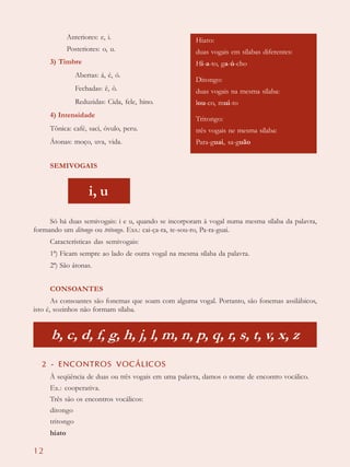 O documento descreve os principais conceitos de fonética, incluindo a classificação dos fonemas em vogais, semivogais e consoantes. Também explica os encontros vocálicos de ditongos, tritongos e hiato, além de conceitos como sílaba, tonicidade e encontros consonantais.