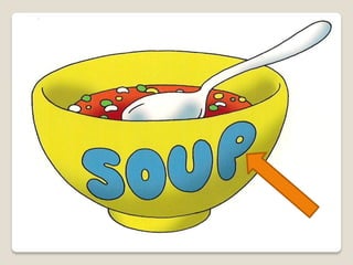 O documento lista diferentes tipos de comida, incluindo um bolo de aniversário, sorvete, biscoitos, suco, pizza, batatas fritas, hambúrguer, sanduíche, frango, ovos, espaguete, salada, arroz e peixe.