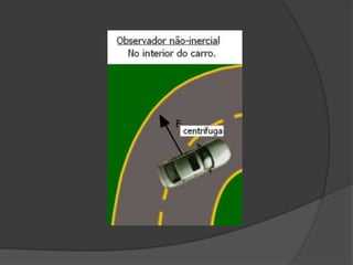O documento descreve a força centrífuga gerada por sistemas em rotação, como um carro em curva alta velocidade. Explica que a força centrífuga empurra objetos para fora do centro de rotação e fornece fórmulas para calculá-la. Também inclui um vídeo ilustrando a ação da força em uma bola lançada em um disco giratório.