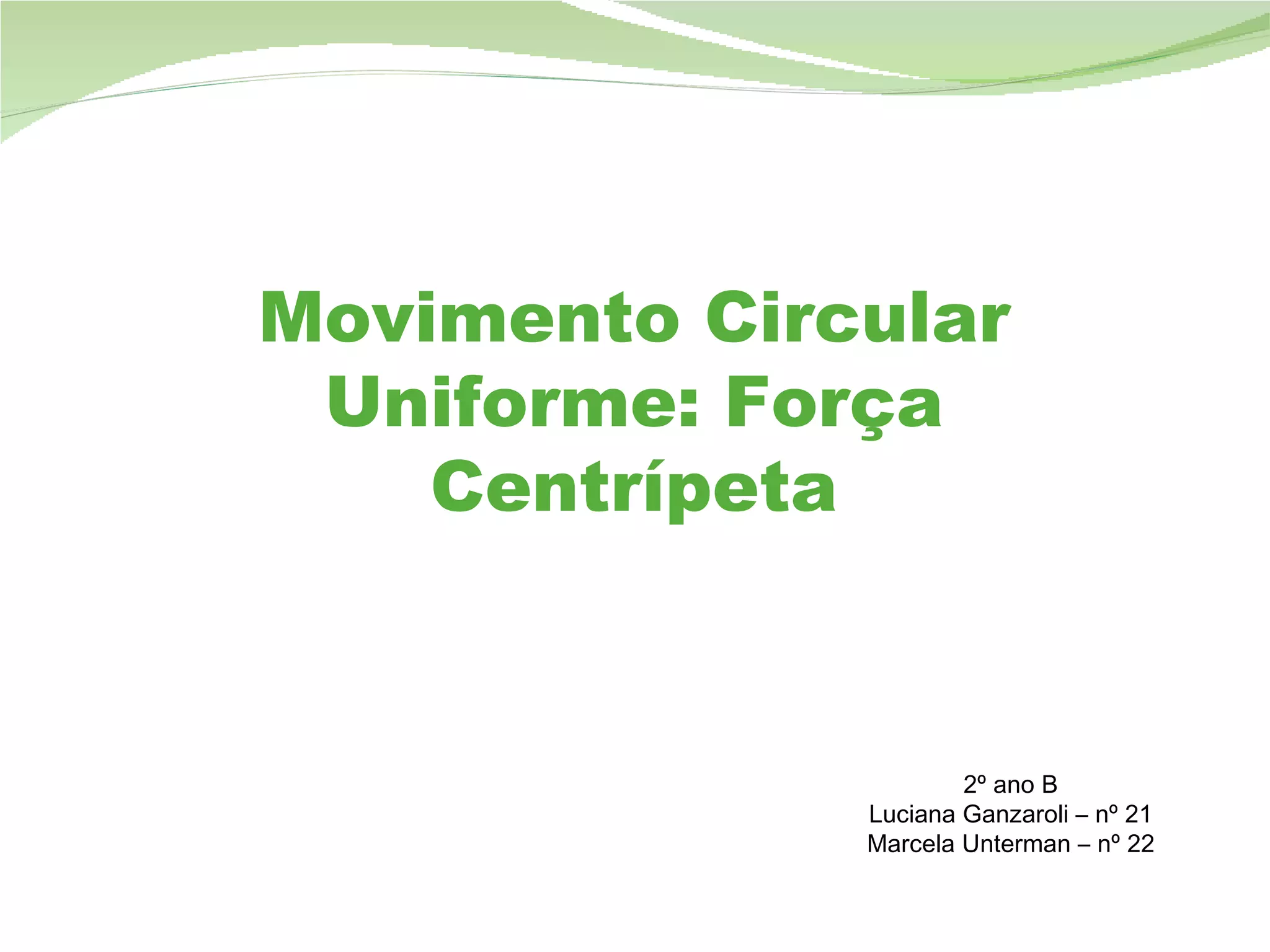 O documento descreve o movimento circular uniforme, definindo período como o tempo para completar uma volta e frequência como o número de voltas por segundo. Explica que a força centrípeta mantém um objeto em trajetória circular e pode ser calculada usando a massa, velocidade angular ou raio. Fornece também a fórmula para calcular a aceleração centrípeta usando a velocidade e o raio.