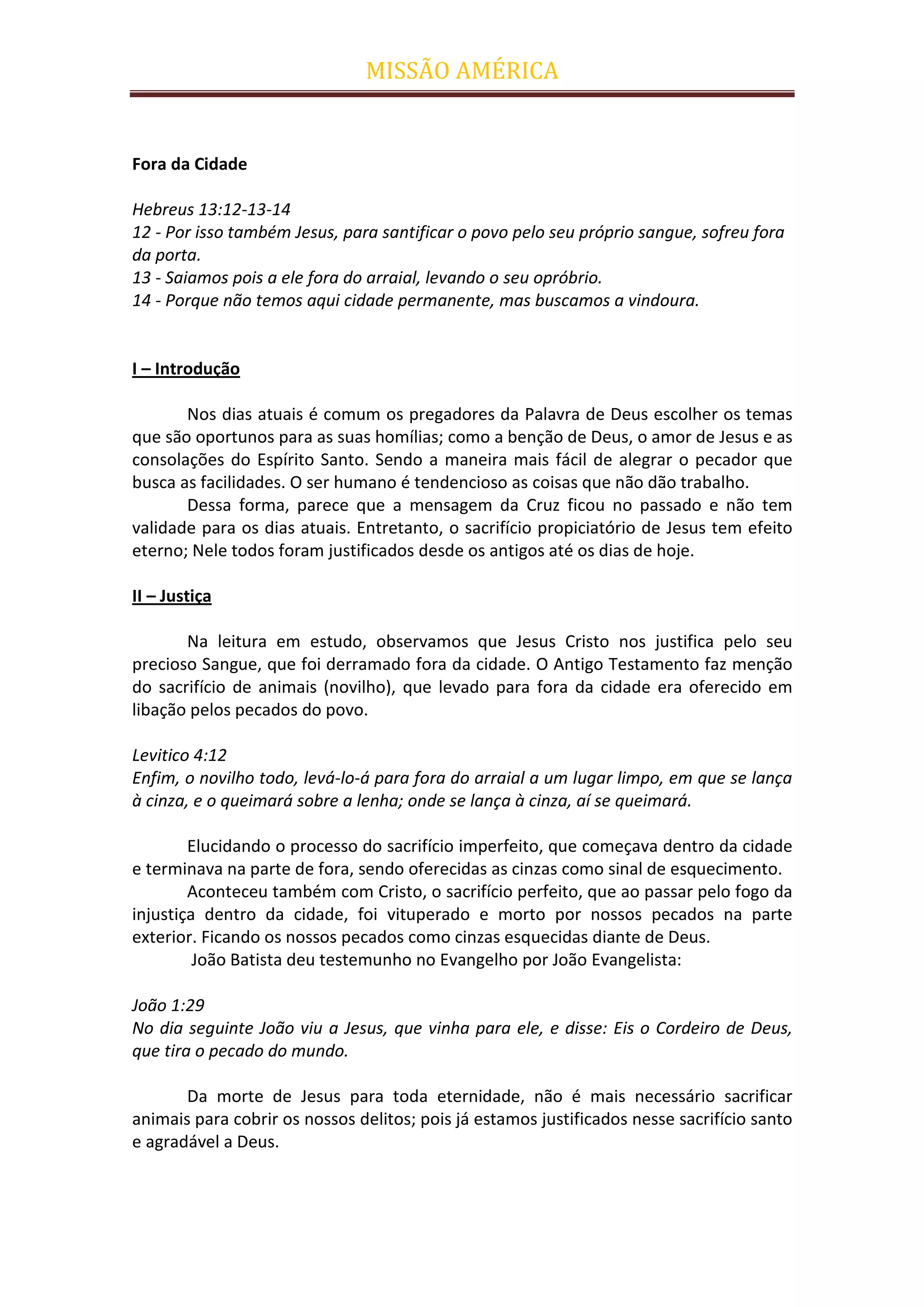 O documento discute como Jesus foi crucificado fora da cidade para pagar pelos pecados da humanidade. Ele explica que os sacrifícios do Antigo Testamento também aconteciam fora da cidade e que Jesus foi o sacrifício perfeito. O documento incentiva os leitores a deixarem o pecado e seguirem a Jesus fora do mundo corrompido.