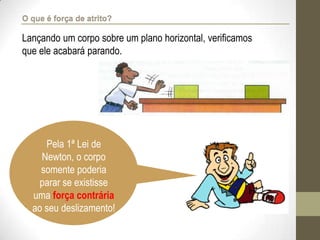 O documento discute o que é força de atrito e seus tipos. A força de atrito é a resistência que corpos em contato oferecem ao movimento, sendo definida por Fat=μN, onde μ é o coeficiente de atrito e N é a força normal. Existem atrito estático e dinâmico, sendo o coeficiente estático maior que o dinâmico.
