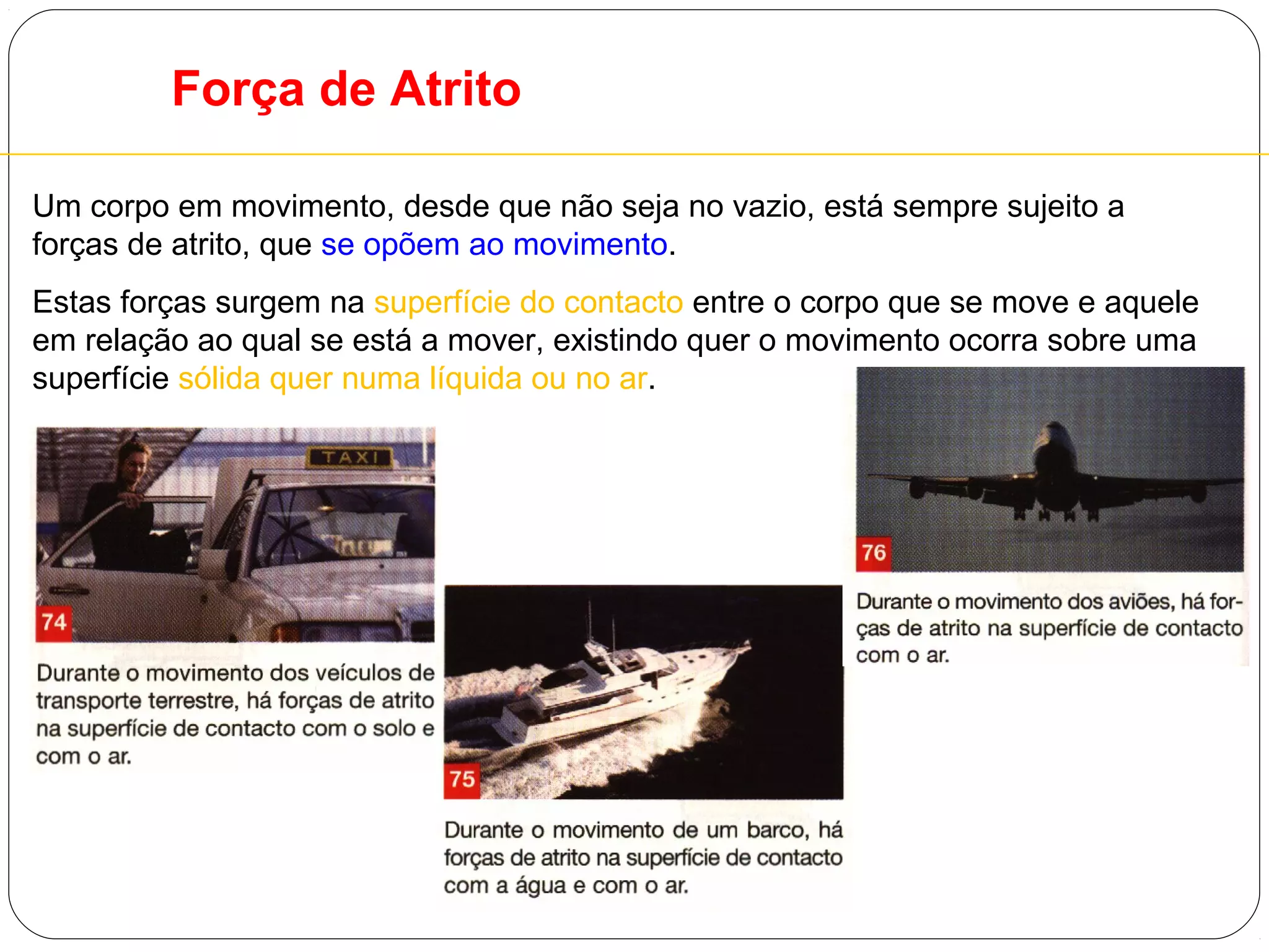 1) Um corpo em movimento está sujeito a forças de atrito que se opõem ao seu movimento, surgindo quando um corpo se move sobre uma superfície sólida, líquida ou no ar.