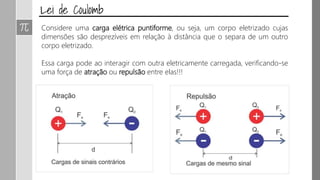 1. O documento descreve a Lei de Coulomb sobre a força de interação entre cargas elétricas pontuais e como esta força varia inversamente com o quadrado da distância entre as cargas.