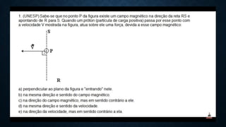1) A força magnética atua sobre cargas elétricas em movimento e depende da carga, velocidade e campo magnético.