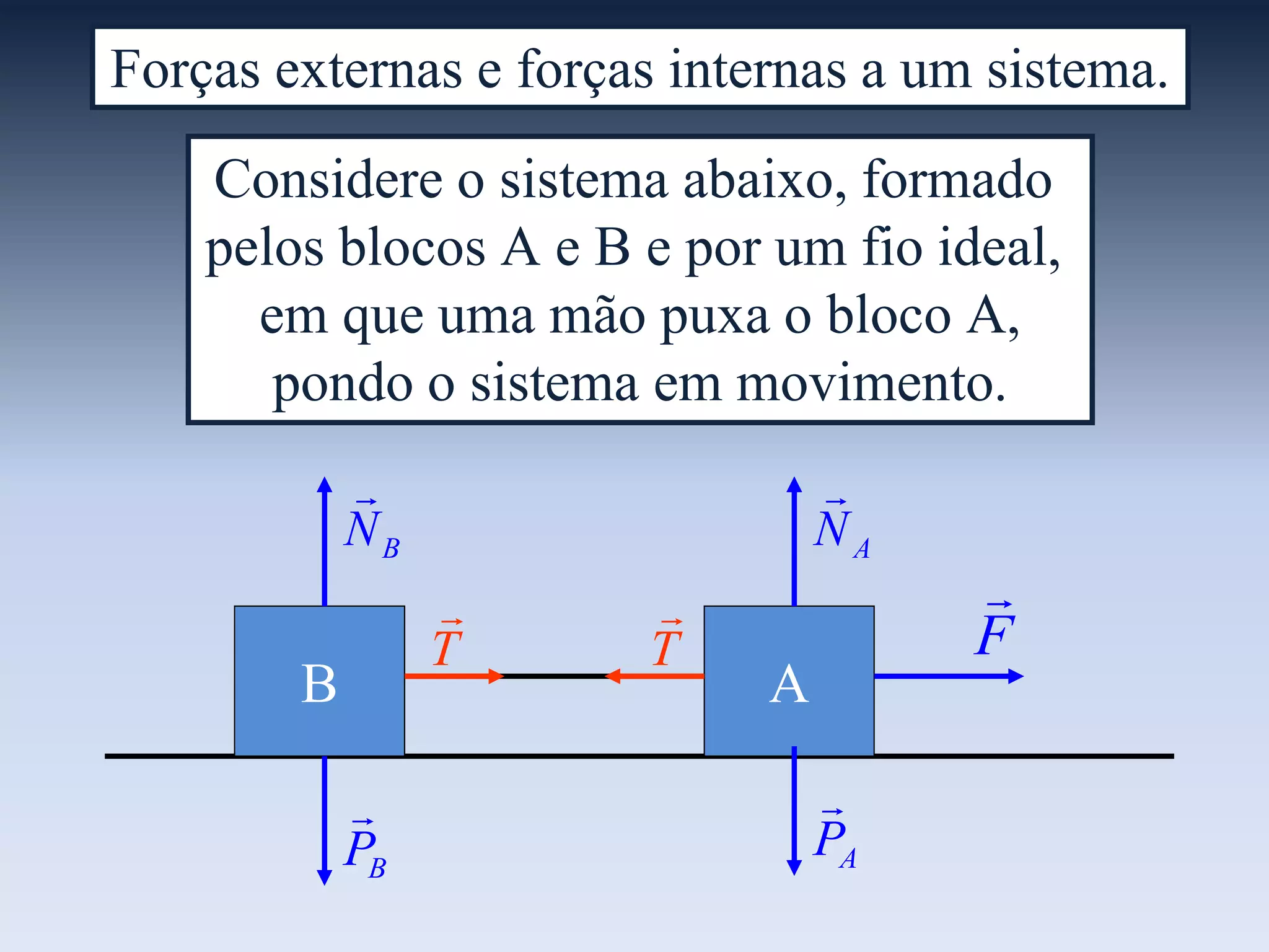 O documento descreve um sistema formado por dois blocos A e B ligados por um fio, onde uma força externa F é aplicada pelo bloco A. Ele explica que forças externas são aplicadas por elementos fora do sistema, como F, enquanto forças internas são aplicadas entre elementos dentro do sistema, como a tração entre os blocos. Também aplica as leis de Newton separadamente aos blocos e ao sistema como um todo, onde as forças internas se anulam.