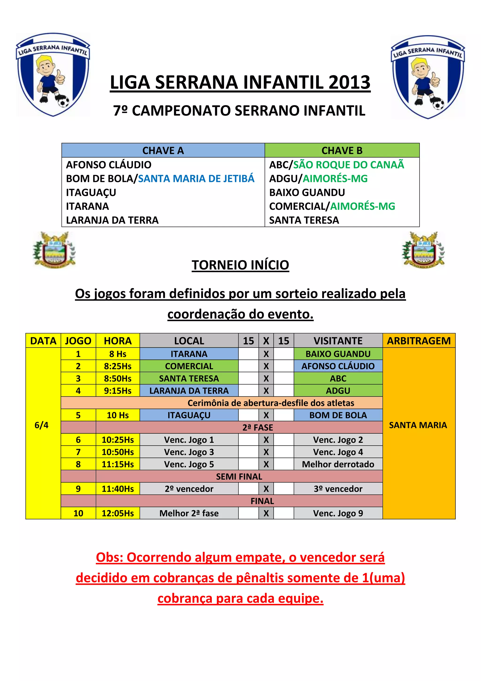 O documento descreve o planejamento do 7o Campeonato Serrano Infantil, incluindo a divisão das equipes nas chaves A e B, a tabela de jogos de cada chave, as fases eliminatórias e as sedes das finais.
