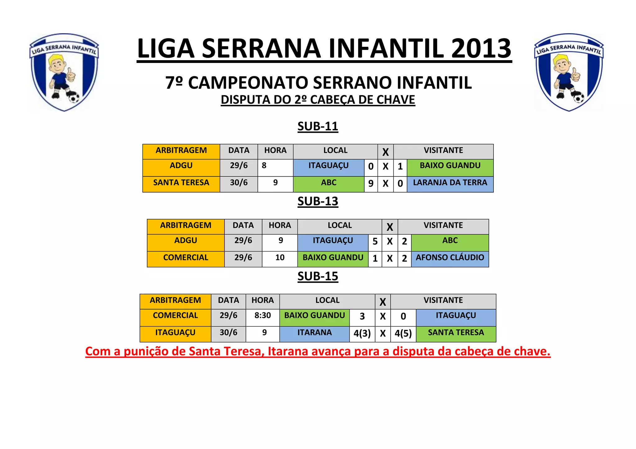 O documento apresenta resultados de partidas de futebol juvenil entre times das categorias sub-11, sub-13 e sub-15. É informado quem avançou para as disputas dos cabeças de chave e da repescagem, assim como os confrontos das fases seguintes do campeonato.