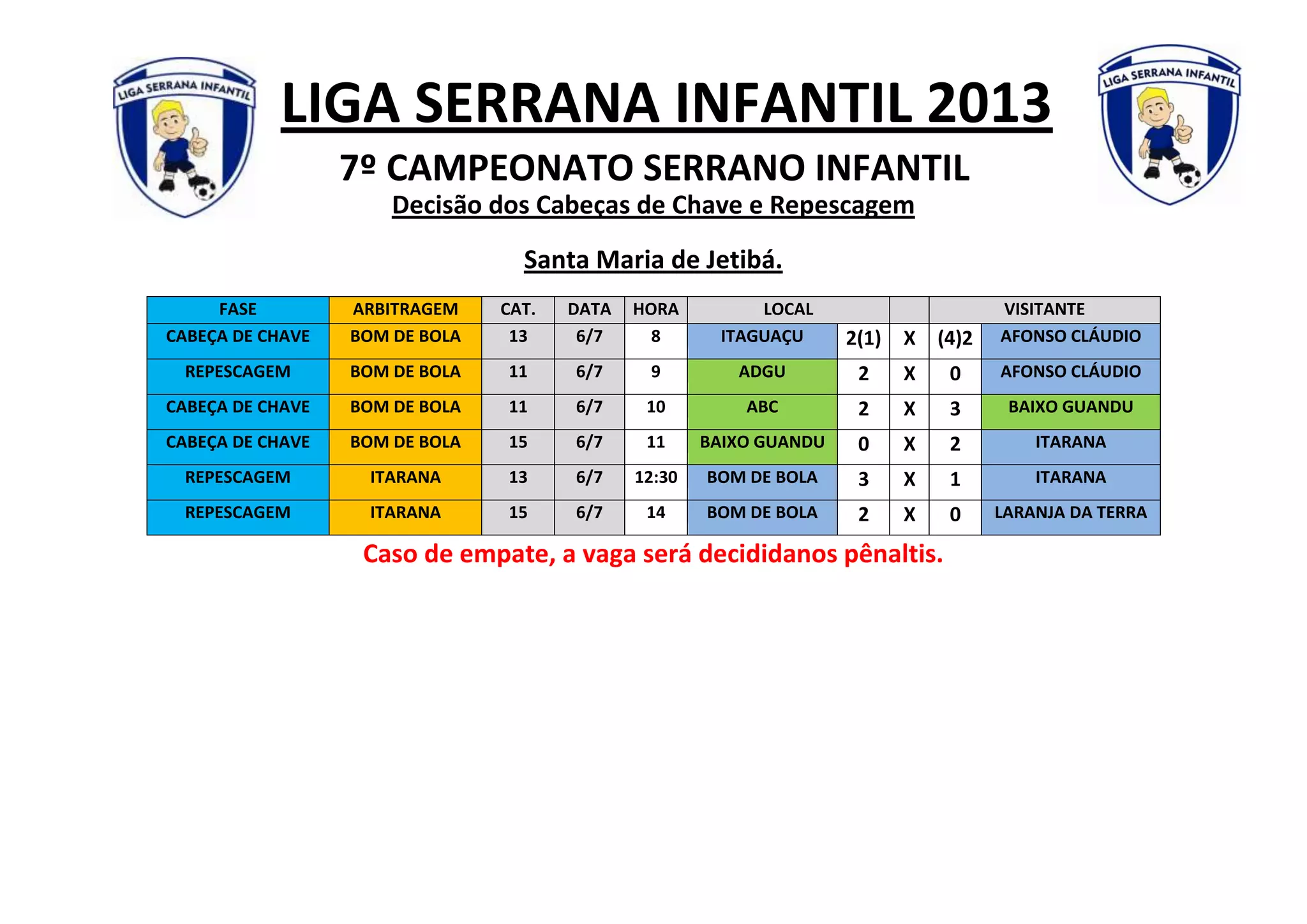O documento apresenta a programação das partidas das fases de cabeça de chave e repescagem do campeonato serrano infantil de 2013 em Santa Maria de Jetibá. Inclui os horários, datas e locais das partidas, além das equipes participantes. Também mostra a classificação geral do campeonato e a programação das fases finais em Baixo Guandu.