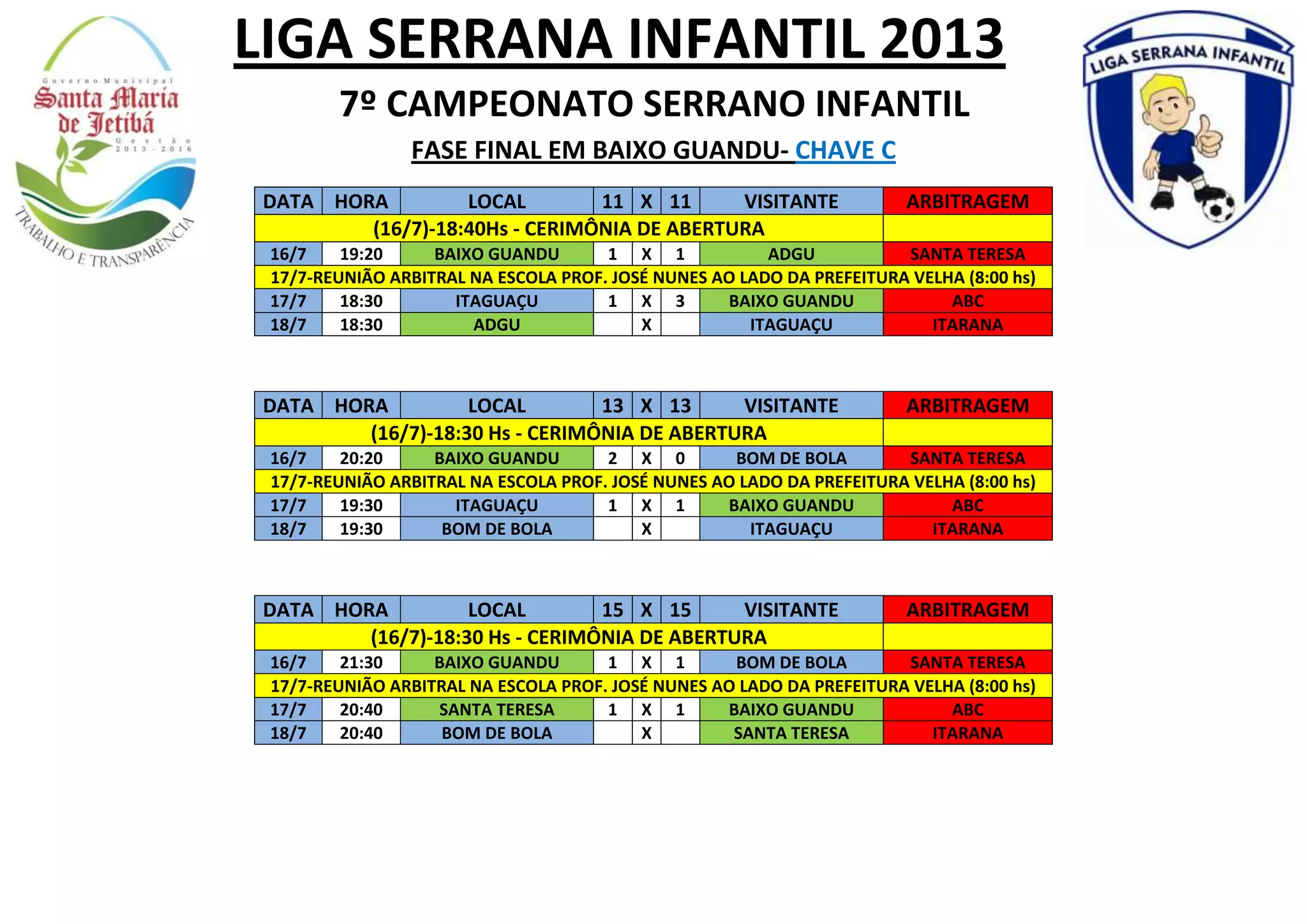 Este documento contém informações sobre jogos e tabelas de pontuação de campeonatos infantis de futebol realizados em Baixo Guandu, incluindo datas, horários, locais, times visitantes e arbitragens para partidas das chaves A, B, C e D nas categorias sub-11, sub-13 e sub-15. Também fornece resultados, classificações e premiações.