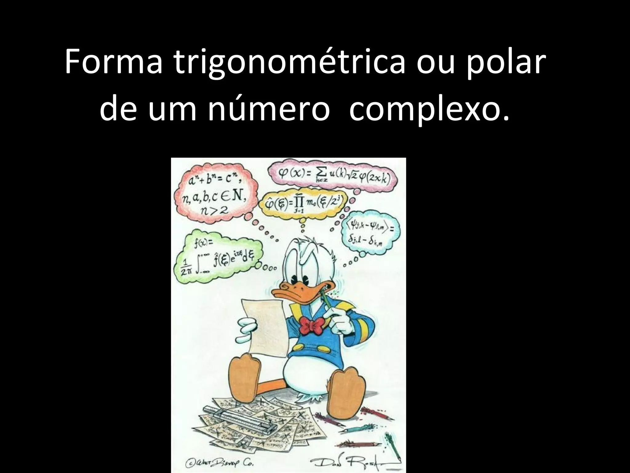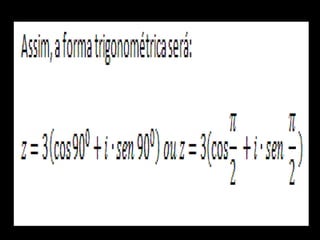 Um número complexo pode ser expresso em forma trigonométrica ou polar, onde o módulo ρ representa a magnitude do número e o argumento θ representa o ângulo. Substituindo esses valores na forma algébrica z = a + bi, obtém-se a forma trigonométrica z = ρ(cosθ + isenθ).