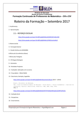 Este documento apresenta o roteiro de uma formação continuada de professores de matemática dos anos finais do ensino fundamental. O roteiro inclui apresentações, oficinas e atividades sobre tópicos como circunferência, triângulos, teorema de Pitágoras e homotetia. As oficinas visam aplicar esses conceitos matemáticos de forma prática por meio de atividades manuais. O documento também discute avaliações de alunos e perspectivas para oficinas futuras.