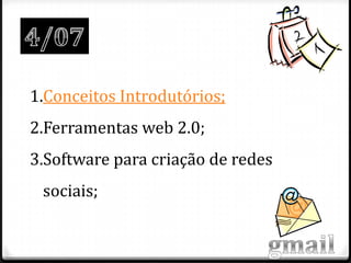 Este documento apresenta uma introdução às ferramentas da Web 2.0, incluindo redes sociais, ferramentas de escrita colaborativa e comunicação online. Ele também define um trabalho prático no qual os participantes devem desenvolver um plano para abordar um tema escolhido em um curso futuro utilizando pelo menos uma ferramenta Web 2.0. O trabalho será avaliado com base em critérios como a escolha do tema, abordagem, ferramentas utilizadas e continuidade do plano.