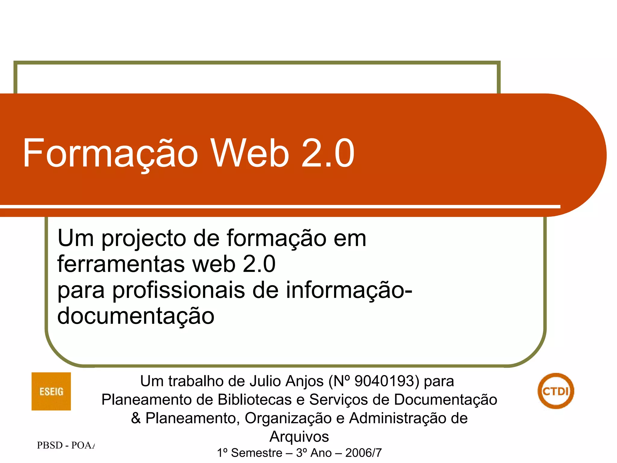 Este documento descreve um plano de formação em ferramentas da Web 2.0 para profissionais de informação e documentação. O plano consiste em nove semanas de aprendizagem auto-dirigida com foco em ferramentas como blogs, Flickr, RSS, wikis e podcasts. O objetivo é expor os participantes a novas ferramentas, encorajar experimentação e expandir suas habilidades digitais para melhor servir as necessidades de usuários em evolução.
