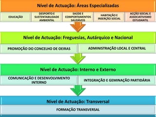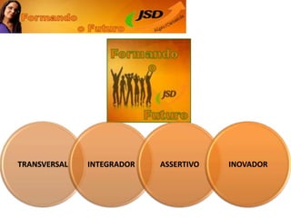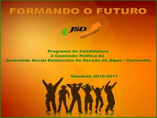 O documento apresenta a candidatura 'Formando o Futuro' da Juventude Social Democrata (JSD) da secção de Algés/Carnaxide, focando na formação política e social dos jovens. Destaca a importância da inclusão, a promoção de iniciativas nas áreas de educação, saúde, desporto e sustentabilidade, e o objetivo de atrair novos militantes. O projeto busca ser uma alavanca para a reconciliação dentro do partido e com a jovem comunidade em Oeiras.
