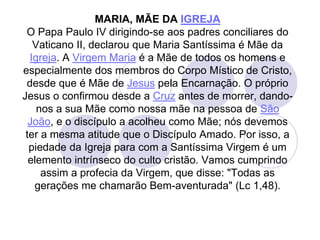 1) O documento discute a Virgem Maria como Mãe da Igreja segundo o Papa Paulo VI no Concílio Vaticano II.