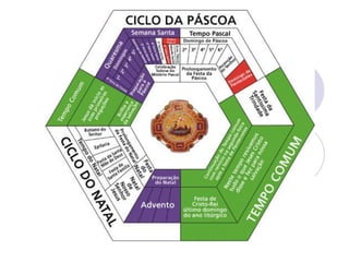3) A estrutura do ano litúrgico católico, incluindo os diferentes tempos como Advento, Natal, Quaresma e Páscoa.
