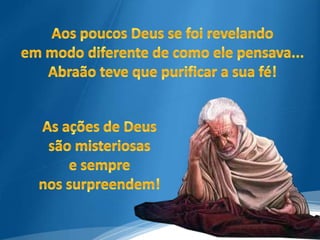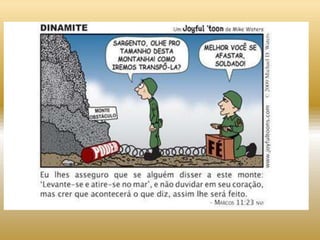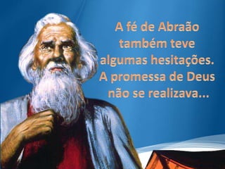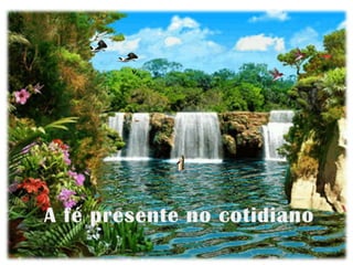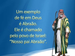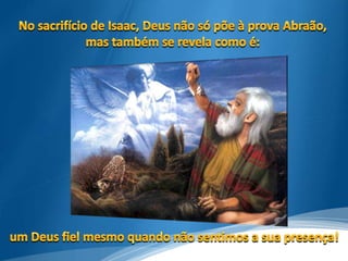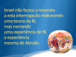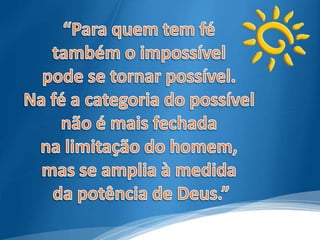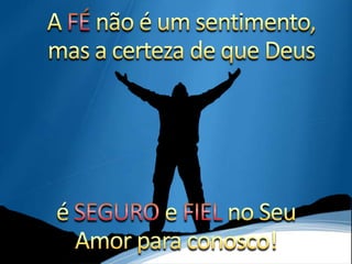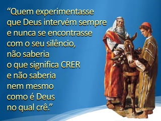 Este documento discute a natureza da fé através de três exemplos: (1) A experiência de fé de Abraão ao seguir Deus mesmo sem entender completamente Suas promessas; (2) A experiência de fé de Jó ao questionar Deus durante seu sofrimento; (3) A fé de Jesus na Cruz ao se entregar a Deus em seu momento mais difícil. A fé é apresentada como um dom de Deus que nos permite enfrentar as adversidades da vida confiando em Sua promessa final.