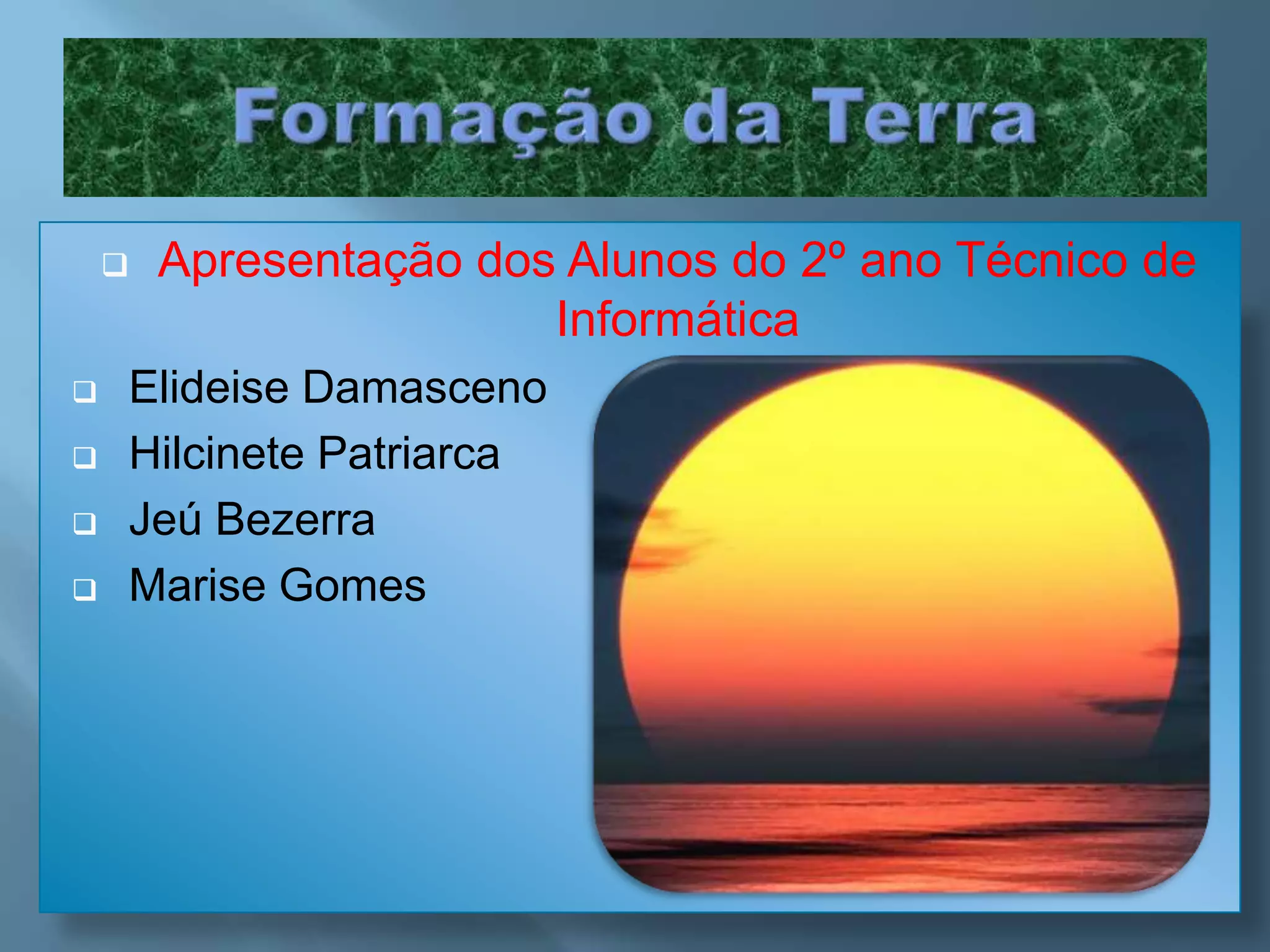 O documento resume a formação da Terra desde a origem do Universo até as eras geológicas, incluindo a Teoria do Big Bang, formação do Sistema Solar, Deriva Continental, Tectônicas de Placas e divisão do tempo geológico em eras. A conclusão reflete sobre a complexidade da origem do Universo e o interesse em pesquisar este assunto, que ainda gera muitas teorias e indagações.