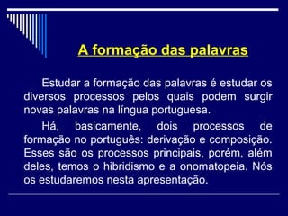 O documento discute os principais processos de formação de palavras na língua portuguesa: a derivação, que envolve acrescentar prefixos e sufixos às palavras; a composição, que une duas ou mais palavras; e a onomatopeia, em que as palavras imitam sons da natureza.