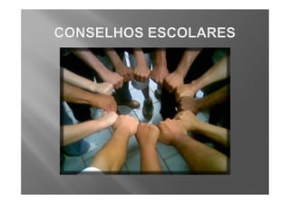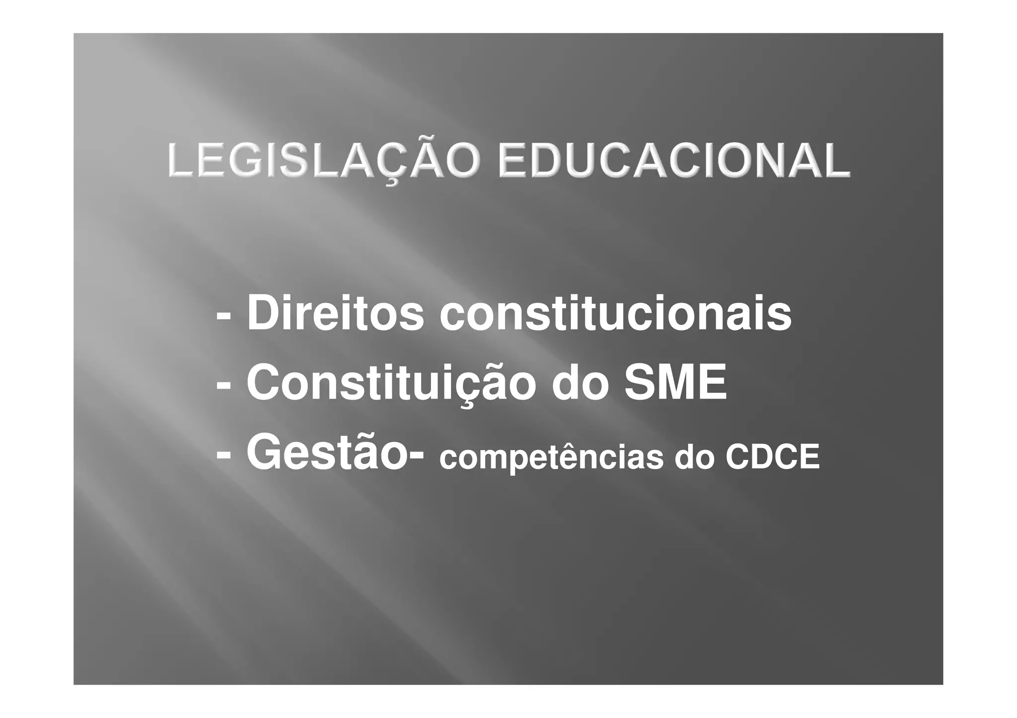 O documento discute os direitos constitucionais à educação e a gestão democrática dos sistemas de ensino no Brasil. Ele descreve as leis e artigos constitucionais que estabelecem os princípios de gratuidade, qualidade e participação comunitária na educação pública. Também define as competências e composição dos Conselhos Deliberativos Escolares para garantir a gestão democrática nas escolas.
