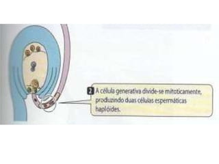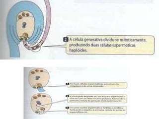 1. O documento descreve o processo de polinização e fecundação em angiospermas, incluindo a formação do pólen e grão de pólen, mecanismos de polinização cruzada e autopolinização, e a dupla fecundação.
