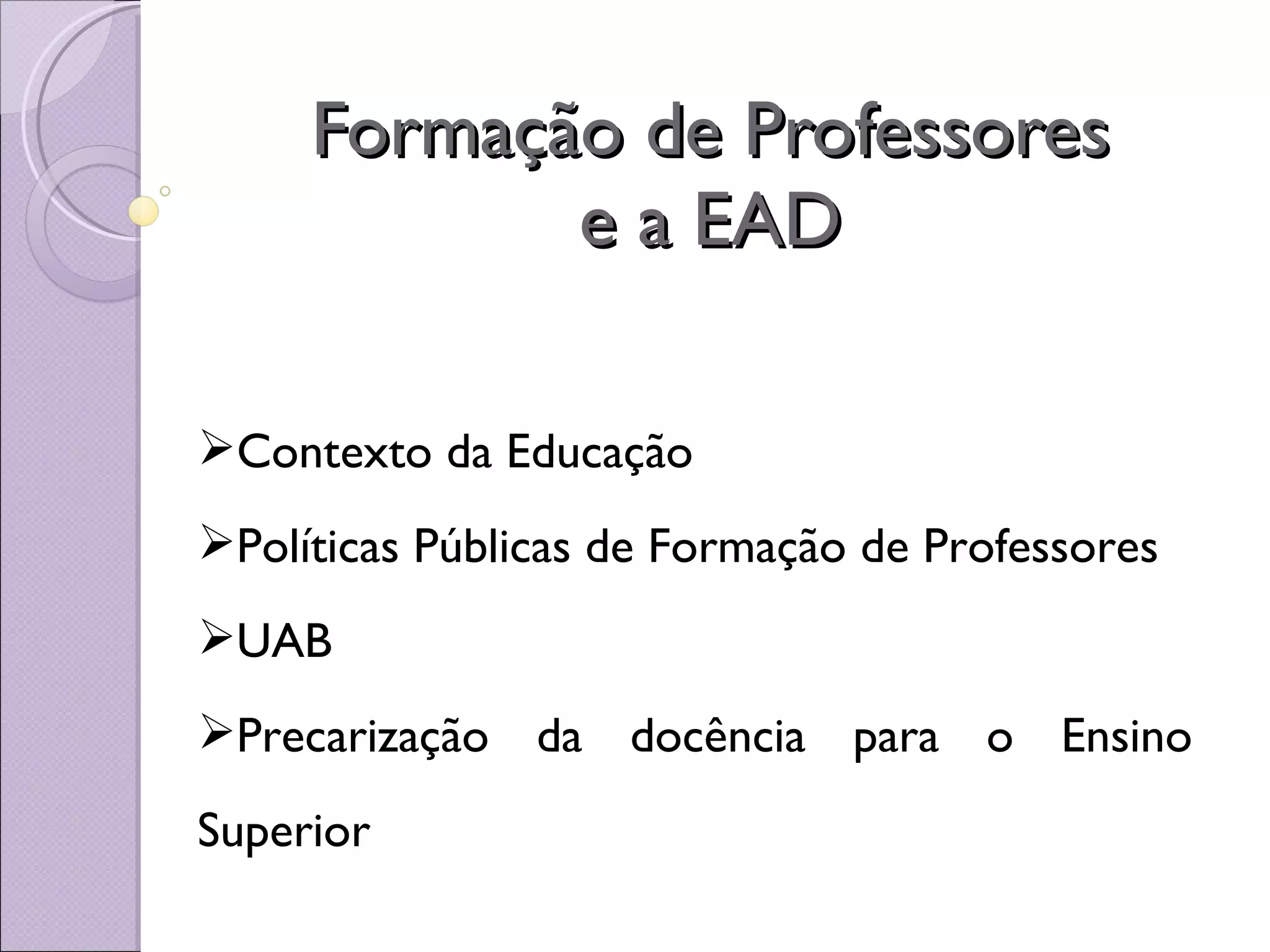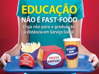 O documento discute a expansão da educação a distância (EAD) no Brasil, especialmente no que se refere à formação de professores. Apresenta problemas relacionados à precarização do trabalho docente e à baixa qualidade da EAD devido à ênfase na massificação em detrimento da mediação pedagógica. Também critica a concepção da EAD como mero substituto tecnológico que desconsidera as condições históricas da docência.