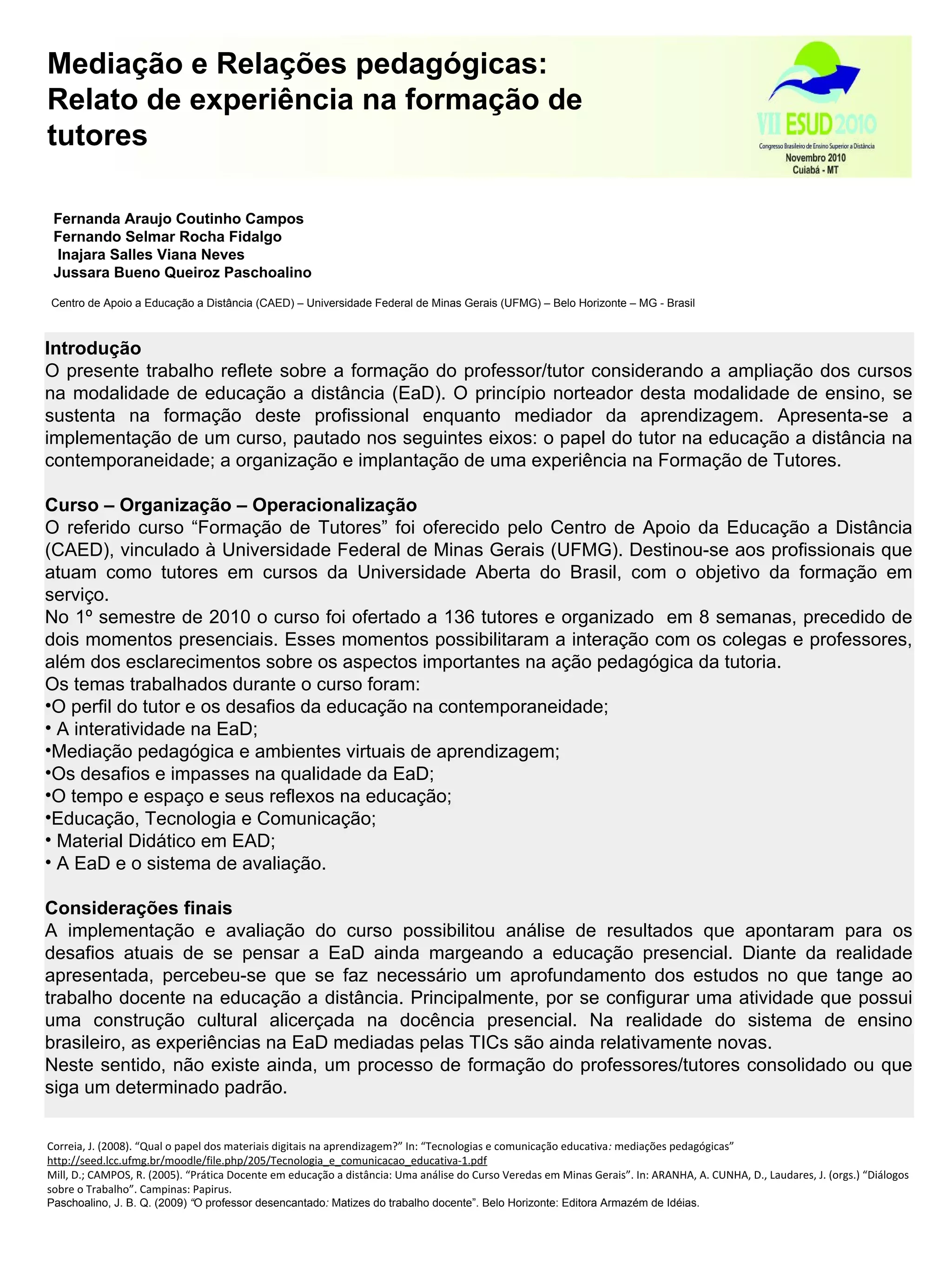 O documento descreve a implementação de um curso de formação de tutores para a educação a distância na Universidade Federal de Minas Gerais. O curso foi oferecido a 136 tutores e organizado em 8 semanas com encontros presenciais. Os temas abordados incluíram o papel do tutor, interatividade, mediação pedagógica, qualidade na educação a distância e avaliação. A avaliação do curso apontou desafios em pensar a educação a distância considerando a educação presencial e a necessidade de mais estudos