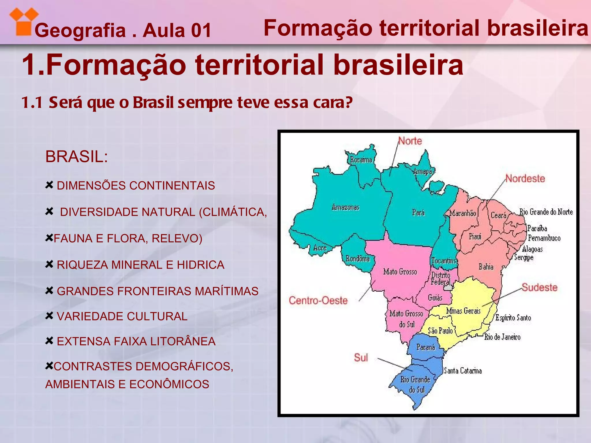 O documento descreve a formação territorial do Brasil ao longo dos séculos, com transformações espaciais que incluíram a ocupação inicial da costa no século XV, a organização de capitanias e economia canavieira no século XVI, e a interiorização e diversificação econômica nos séculos seguintes, resultando na configuração atual do país.