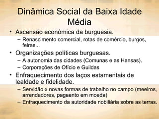 1) O documento descreve a ascensão da burguesia e o enfraquecimento do poder nobiliário na Baixa Idade Média, levando à formação das monarquias nacionais.