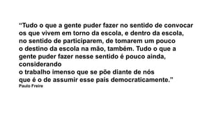 Este documento descreve o processo de implantação do Conselho Escolar da Escola Zenóbia e Felizardo em 2014, com o objetivo de fortalecer a gestão democrática da escola através da participação da comunidade escolar. O documento explica os princípios, funções e composição do Conselho Escolar, além do processo de eleição de seus membros representantes dos diferentes segmentos da comunidade escolar.
