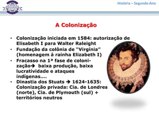 A colonização dos Estados Unidos iniciou-se em 1584 com a autorização da rainha Elizabeth I para Walter Raleigh. As 13 colônias originais se desenvolveram no século 17 sob o domínio inglês, com diferentes características entre as do norte e as do sul. No século 18, os impostos e o controle mais rígidos da Grã-Bretanha sobre as colônias levaram à independência dos EUA em 1776.