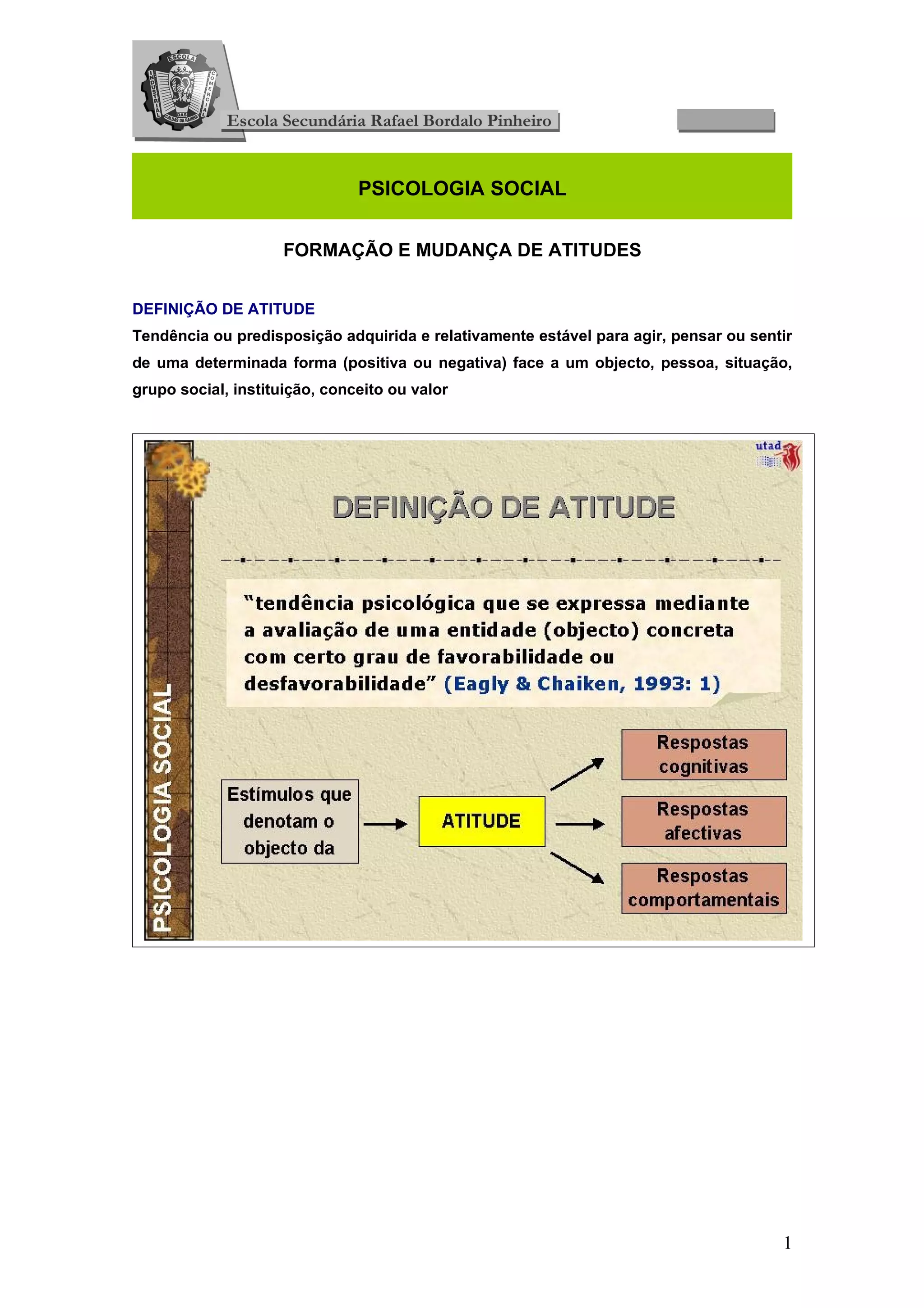 Este documento discute atitudes em psicologia social. Ele define atitude como uma tendência adquirida para agir, pensar ou sentir de uma determinada maneira sobre um objeto. As atitudes desempenham várias funções, incluindo guiar decisões e comportamentos, facilitar adaptação à realidade, ajudar a definir identidade social e estabilizar a personalidade.