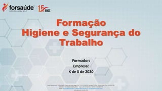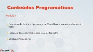 Este documento fornece informações sobre um curso de formação em saúde e segurança no trabalho. Apresenta os objetivos, conteúdos programáticos e enquadramento legal da formação. Detalha os principais conceitos de segurança, higiene e saúde ocupacional como prevenção de acidentes, doenças profissionais e identificação de riscos.