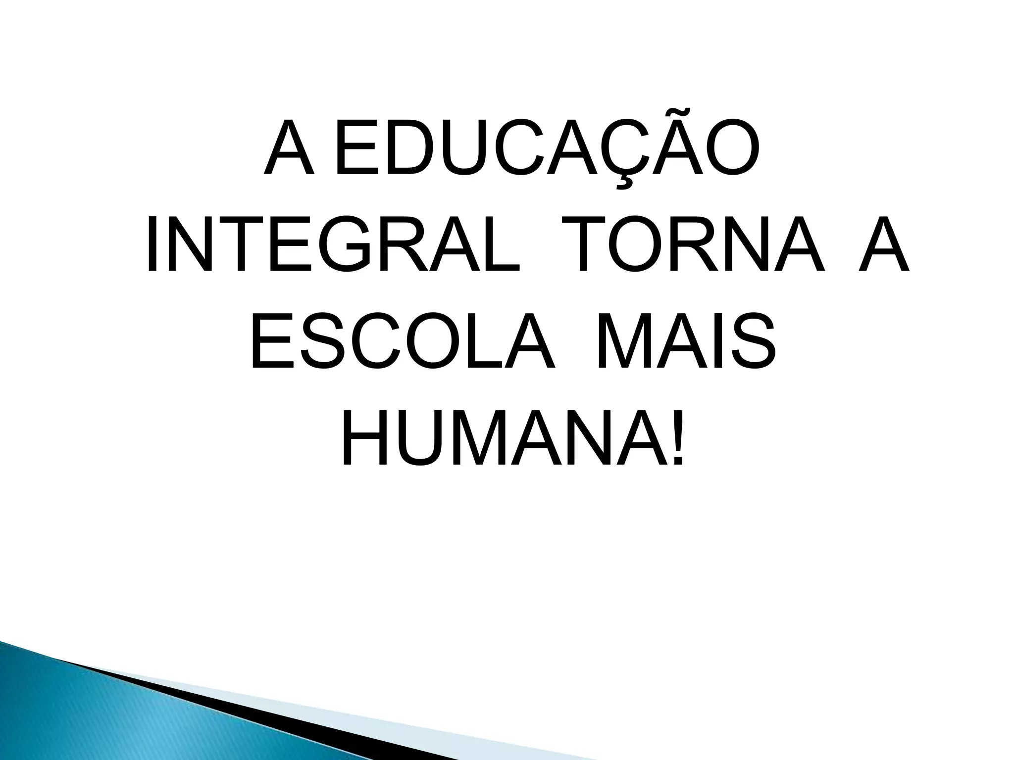 A educação integral promove um desenvolvimento holístico das crianças, reconhecendo que a aprendizagem ocorre em toda a comunidade, não apenas na escola. Ela envolve a família, a comunidade, a cidade e vai além dos conteúdos tradicionais para considerar a vida como uma grande oportunidade de aprendizagem. Professores, currículo, formação e participação ativa de todos os envolvidos precisam ser repensados para uma educação integral ser implementada com sucesso.