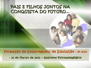 O documento descreve um programa de orientação vocacional para alunos do 9o ano, incluindo sessões semanais, entrevistas individuais e o papel importante dos pais. Também resume os principais percursos de formação após o 9o ano, como cursos científicos, tecnológicos e profissionais, com exemplos de matrizes curriculares.