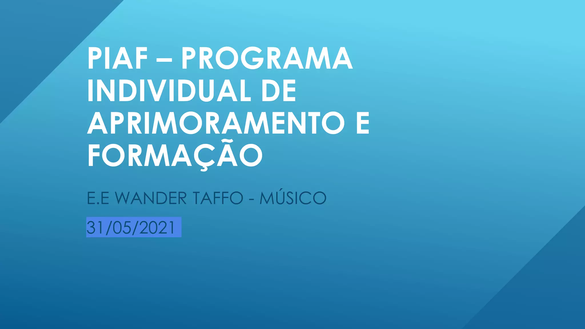 Este documento descreve o Programa Individual de Aprimoramento e Formação (PIAF) para professores da escola Wander Taffo. O PIAF inclui um mapa de competências, plano de ação e cardápio de ações formativas para os professores melhorarem continuamente. O documento também discute os desafios enfrentados em 2020 e 2021 e como o PIAF pode ajudar a superá-los.