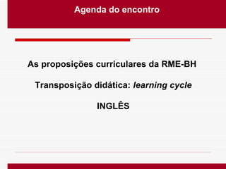 O documento descreve as proposições curriculares da rede municipal de educação de Belo Horizonte para o ensino de inglês. Ele apresenta o desenvolvimento das três capacidades de linguagem por meio de textos de diferentes gêneros discursivos, organizados em quatro estágios de leitura, escrita, audição e fala.