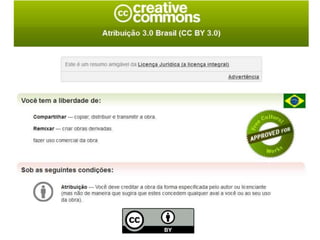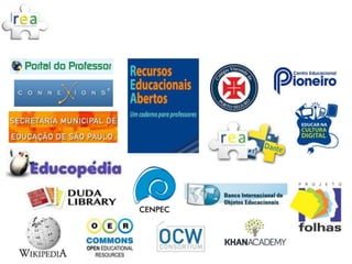 O documento discute Recursos Educacionais Abertos (REA), definindo-os como materiais de ensino que estão sob domínio público ou licenciados de maneira aberta para uso e adaptação. Também aborda formatos abertos, licenças Creative Commons e modelos de negócios baseados em conteúdo aberto.
