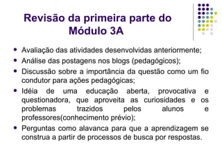 Este documento descreve o segundo encontro presencial do Módulo 3A de uma formação de professores realizada nos dias 20 e 21 de janeiro de 2011 em Palmas, Tocantins. Nele, os participantes revisaram a primeira parte do módulo, analisaram atividades anteriores e discutiram sobre educação questionadora. Também analisaram experiências pedagógicas utilizando metodologias como resolução de problemas e projetos, identificando elementos como autonomia e cooperação.
