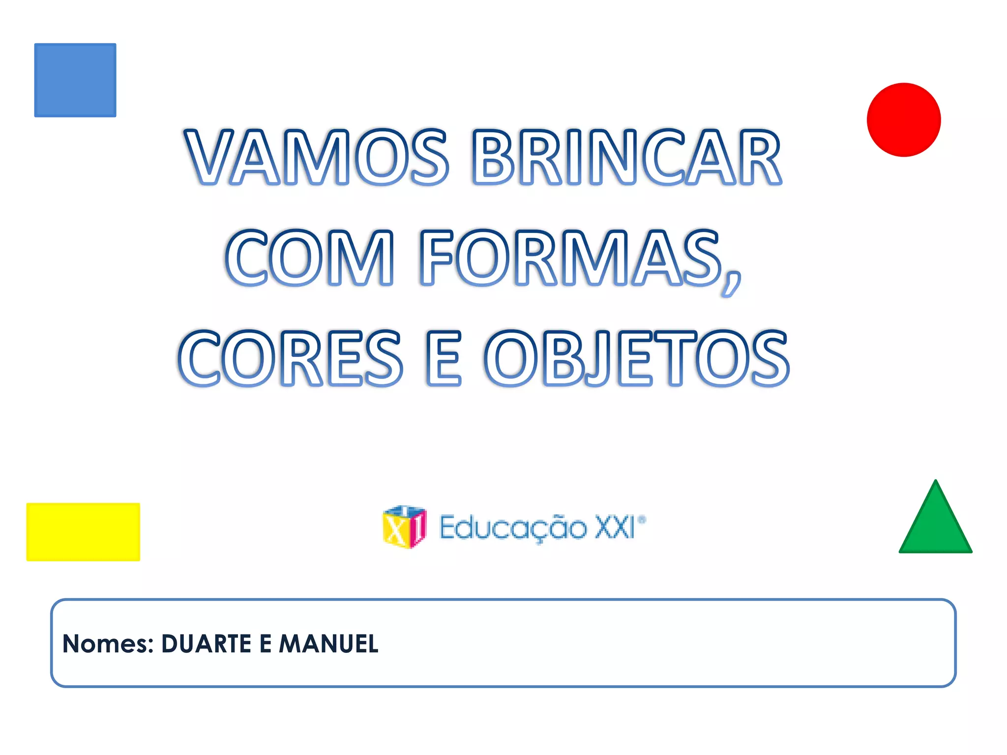 O documento apresenta um quadro de dupla entrada para preencher correspondendo cores e formas geométricas, e outro quadro para assinalar quais formas estão presentes em objetos, pedindo para completá-los.