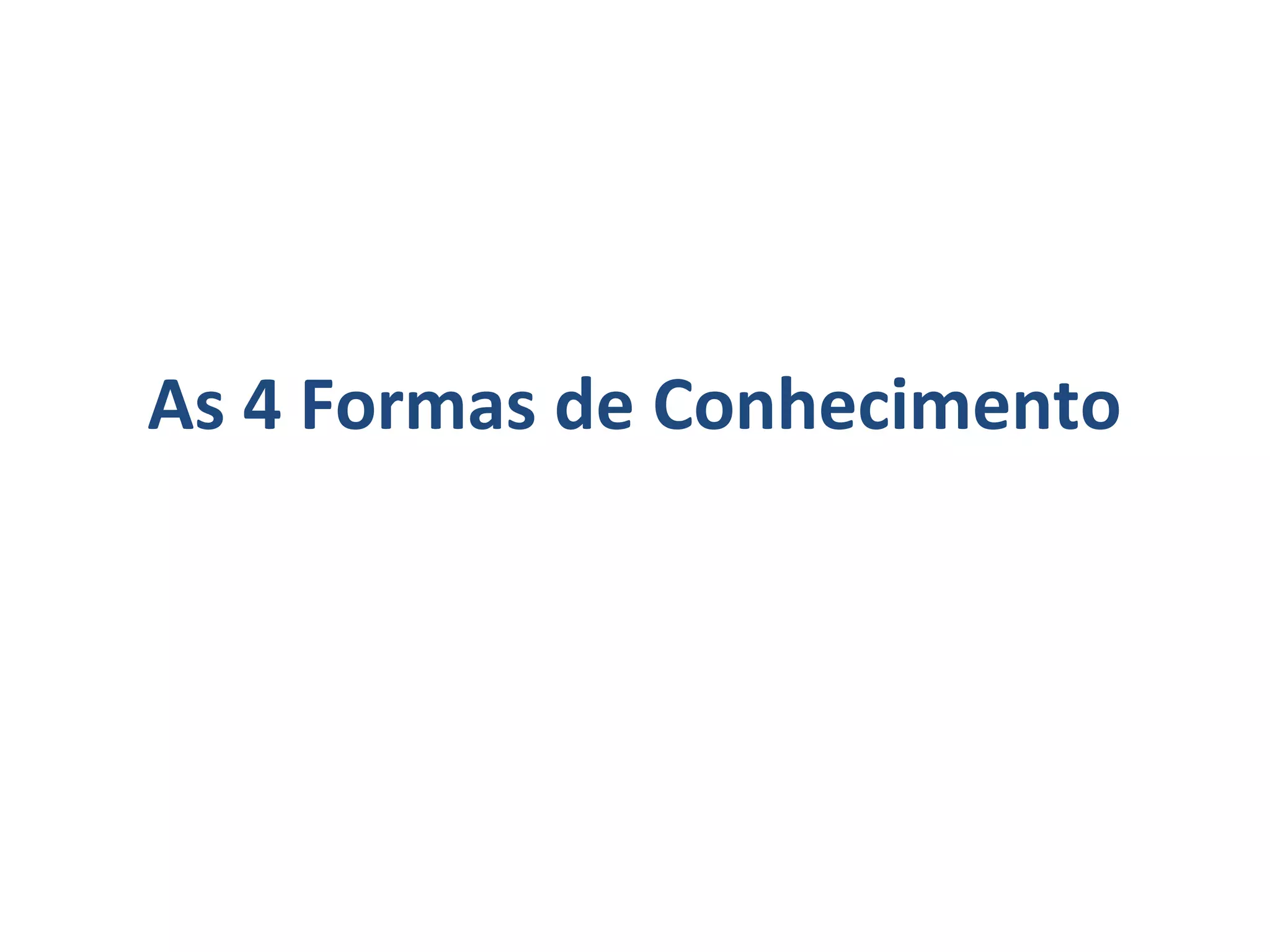 O documento discute os 4 principais tipos de conhecimento: filosófico, científico, religioso e popular. O conhecimento filosófico surge da reflexão e gera conceitos subjetivos, enquanto o científico é obtido de forma racional e busca explicar os fenômenos. O conhecimento religioso baseia-se em doutrinas reveladas e contém verdades consideradas infalíveis. Já o conhecimento popular é adquirido na vida cotidiana de forma não sistemática.