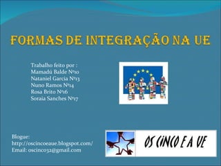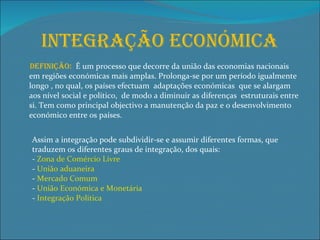 O documento descreve as principais formas de integração econômica entre países, incluindo zonas de comércio livre, união aduaneira, mercado comum, união econômica e monetária e união política. Cada forma representa um grau maior de integração e cooperação econômica e política entre os países envolvidos.