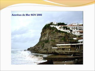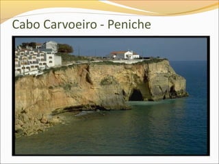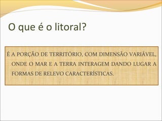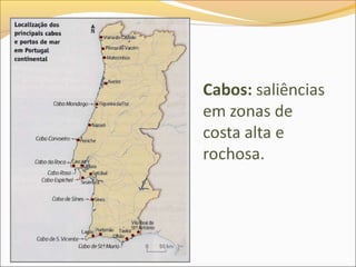 Este documento descreve os principais acidentes geográficos do litoral português, incluindo baías, estuários, deltas, arribas, praias e dunas. Explica como estes acidentes se formaram através de processos de erosão e deposição ao longo de milhões de anos. Também fornece exemplos destes acidentes como a Ria de Aveiro, o Estuário do Tejo, o Lido de Faro e o Tombolo de Peniche.
