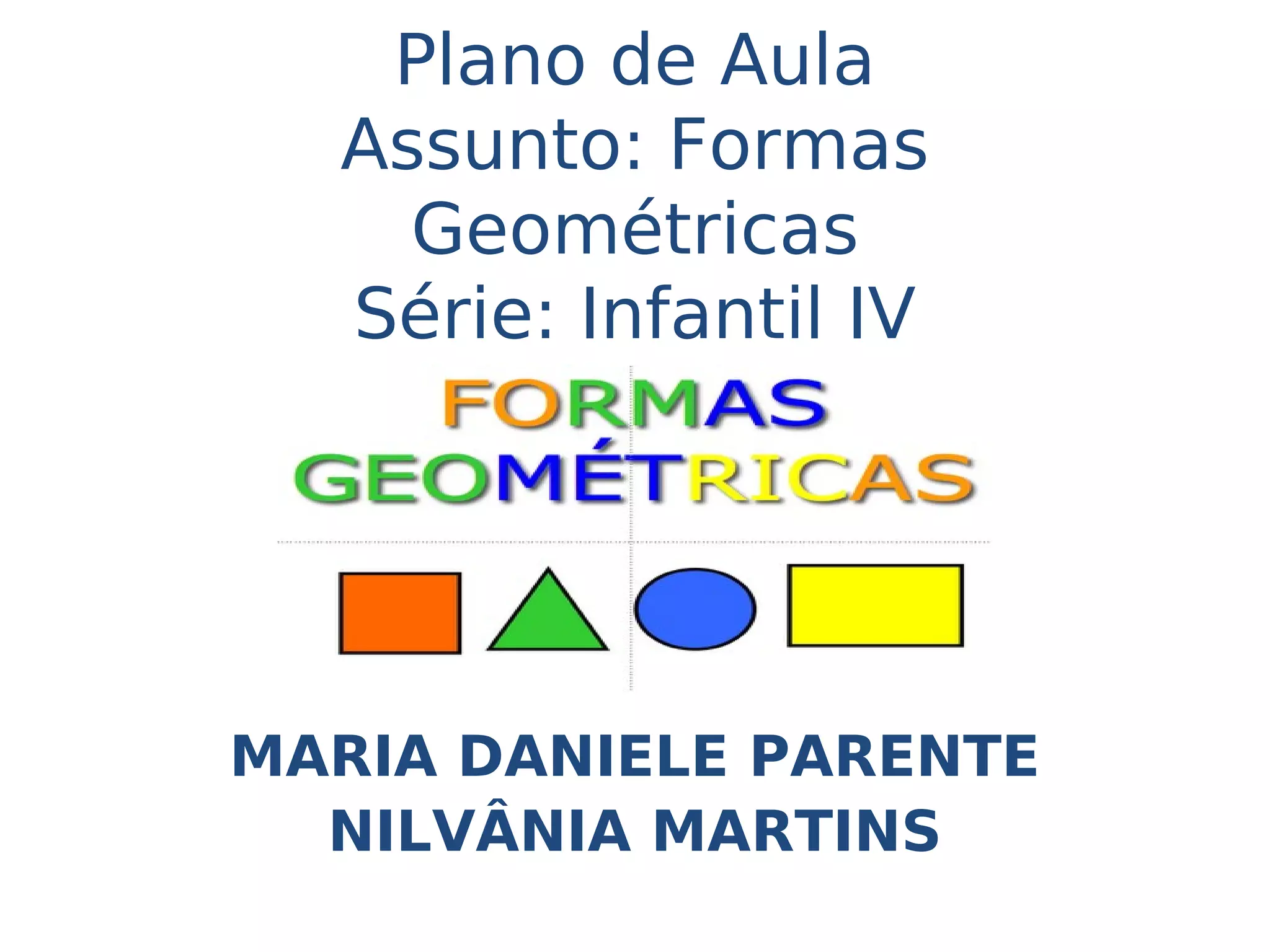O documento apresenta um plano de aula sobre formas geométricas para alunos da série Infantil IV. O objetivo geral é conhecer e explorar formas geométricas, e os objetivos específicos são identificar e diferenciar formas, aprender seus nomes, e relacioná-las a objetos do cotidiano. A aula será desenvolvida em três dias utilizando blocos lógicos, objetos, computadores e materiais manuais.