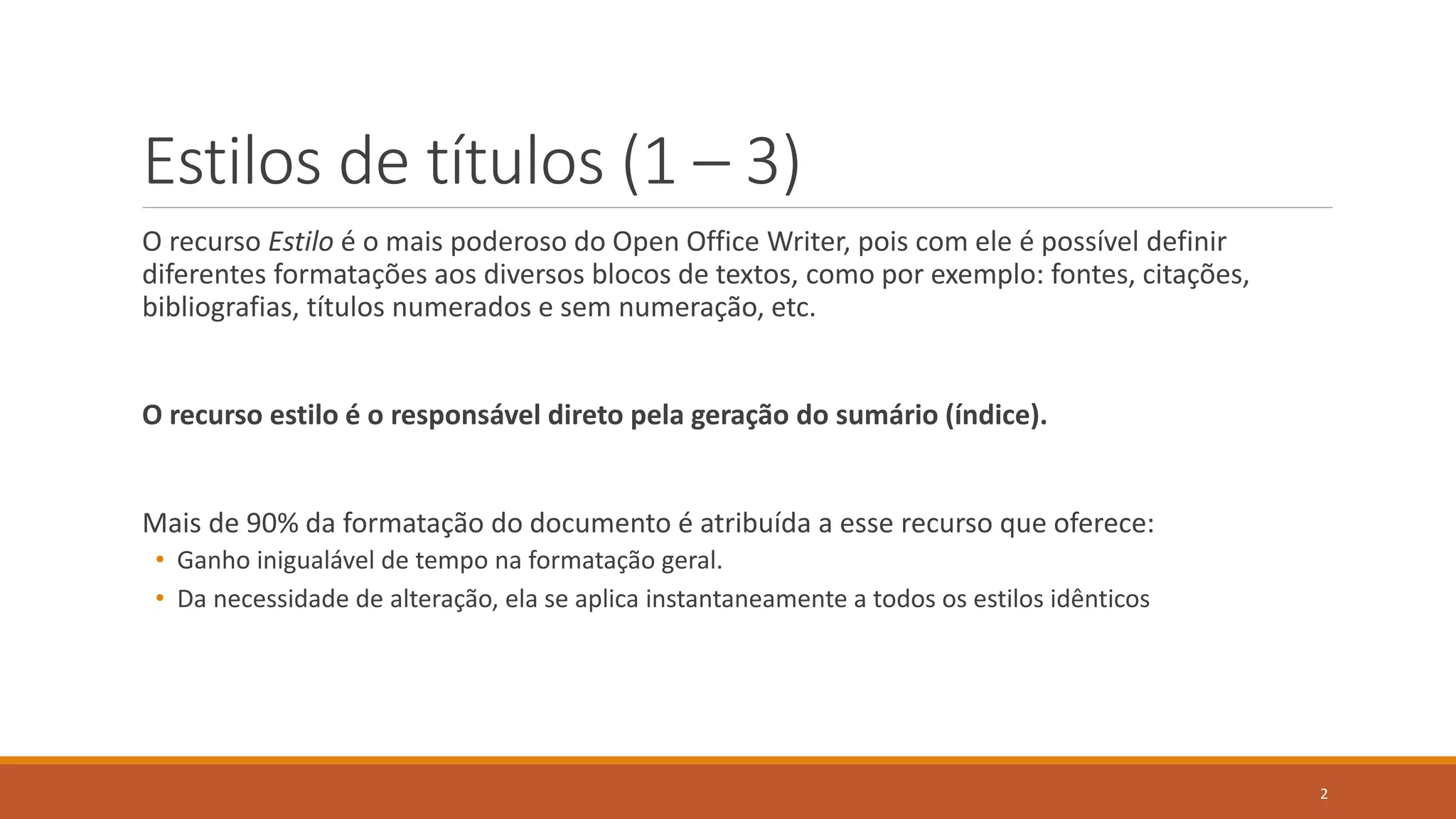 O documento fornece instruções detalhadas sobre como formatar trabalhos utilizando o Open Office Writer, abordando o uso de estilos, marcadores, quebras de página, rodapés, cabeçalhos, numeração de páginas, inserção de figuras e legendas. Define a importância dos estilos na formatação eficiente e na geração automática de sumários. Inclui atividades práticas para aplicar essas técnicas em um documento específico, o 'livro de receitas'.