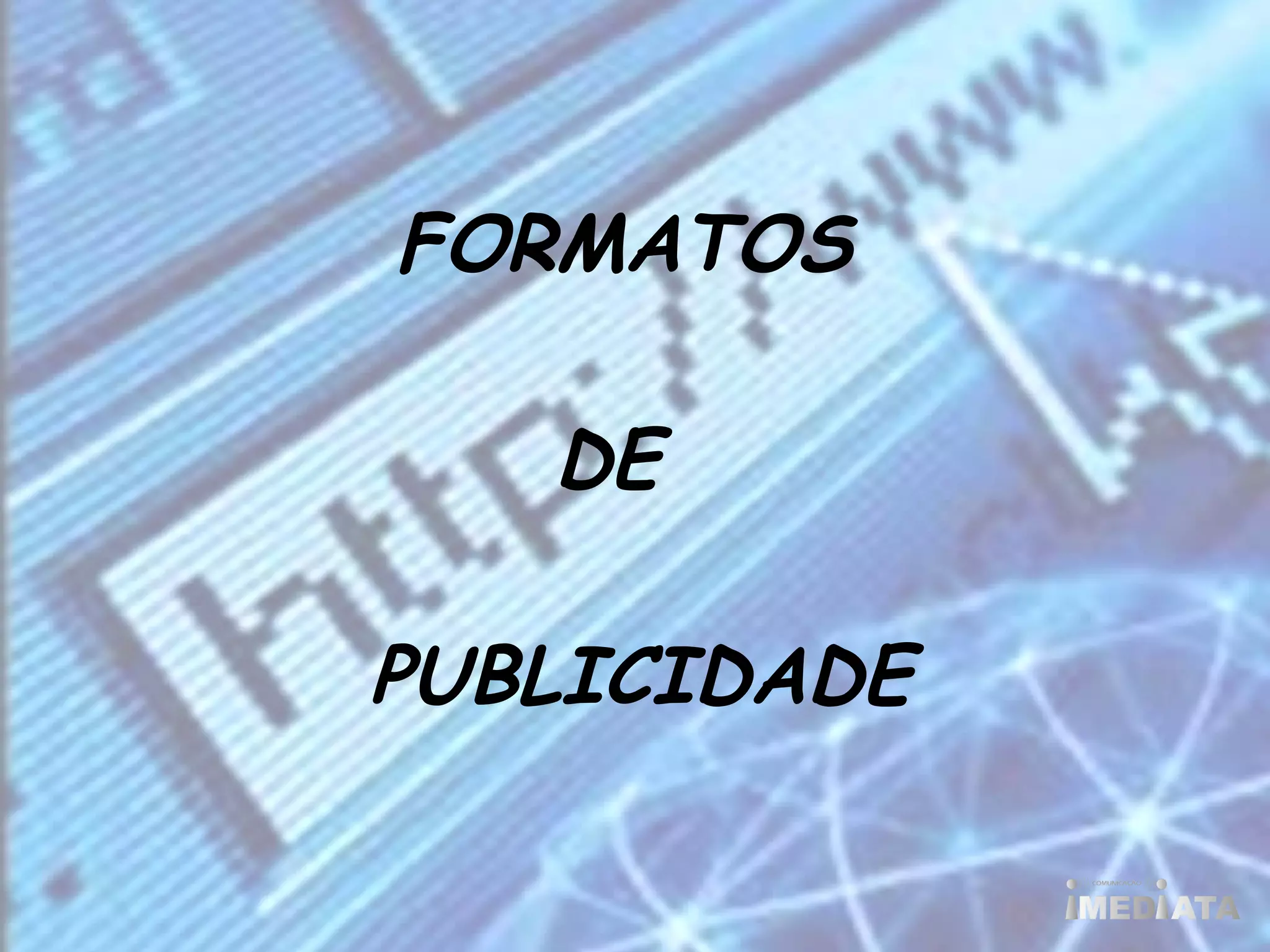 O documento descreve diversos formatos de publicidade online, incluindo banners, links patrocinados, mídia social e soluções de desempenho. Ele especifica as dimensões, peso, formatos, tempo de animação e outras especificações técnicas para cada formato publicitário.