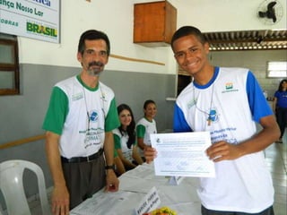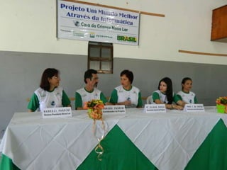 Este documento resume a cerimônia de formatura da 1a turma de 2013 da Casa da Criança Nosso Lar em Peruíbe, realizada em 10 de novembro de 2013. A cerimônia homenageou os pais e amigos e formou 47 jovens. O coordenador do projeto foi Marceú Parrini e a diretora presidente foi Marceli Erdei Parrini.
