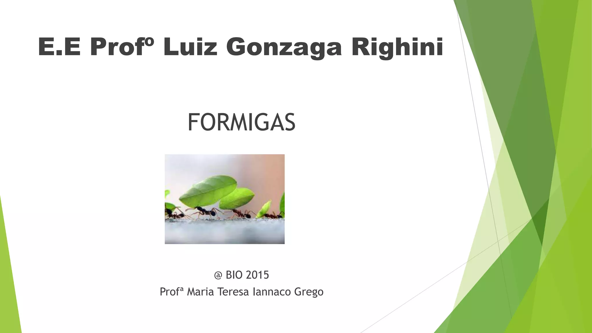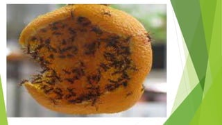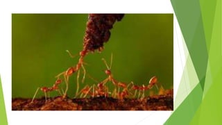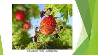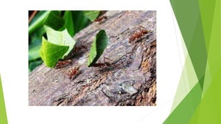 O documento discute a importância das formigas para o meio ambiente, sua organização social em formigueiros e as diferentes castas (rainha, machos e operárias). Também apresenta algumas espécies de formigas comuns e suas características.